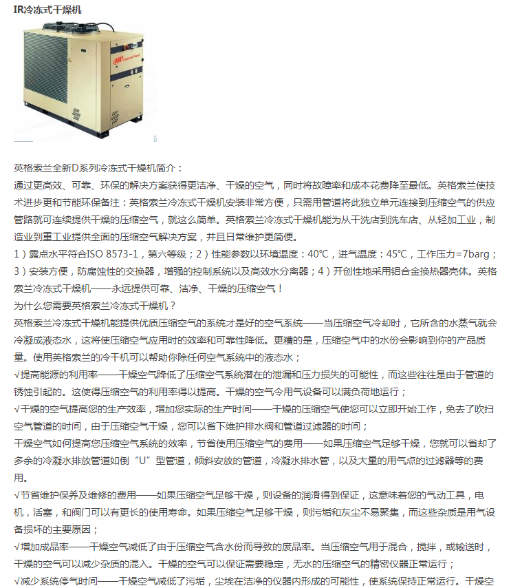 •        濟(jì)南銳博特機(jī)械設(shè)備有限公司是英格索蘭空氣壓縮機(jī)的授權(quán)代理商,代理銷售美國英格索蘭全系列的空壓機(jī)及后續(xù)處理設(shè)備。公司自成立以來,經(jīng)過公司全體同仁不斷努力,開拓創(chuàng)新,以優(yōu)良的技術(shù)、完善的售后服務(wù),使得公司贏得了一個(gè)又一個(gè)的誠心客戶。我公司擁有多名專業(yè)的銷售及售后服務(wù)人員,為客戶提供空壓系統(tǒng)的售前、售中及售后的全方位優(yōu)質(zhì)服務(wù)。另公司有多名具有英格索蘭壓縮機(jī)授權(quán)服務(wù)證書的服務(wù)工程師,能維修和保養(yǎng)國內(nèi)外各種品牌空壓機(jī),公司各種國內(nèi)外品牌空壓機(jī)配件庫存齊全。